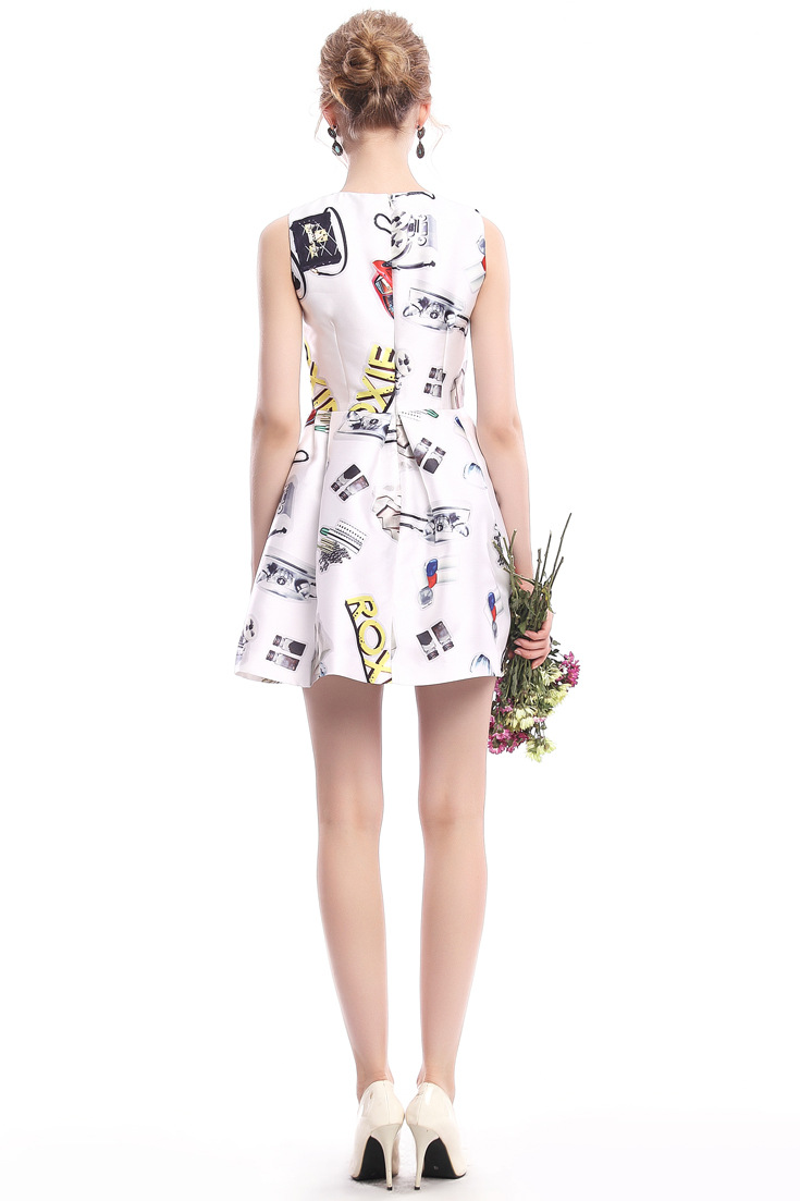 2015春夏品牌女装新款 圆领无袖斜纹印花修身A字裙连衣裙