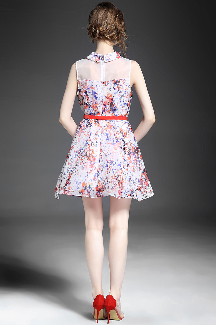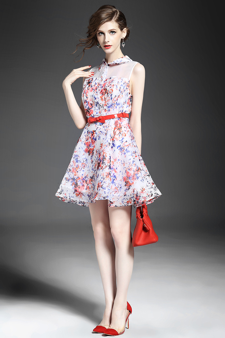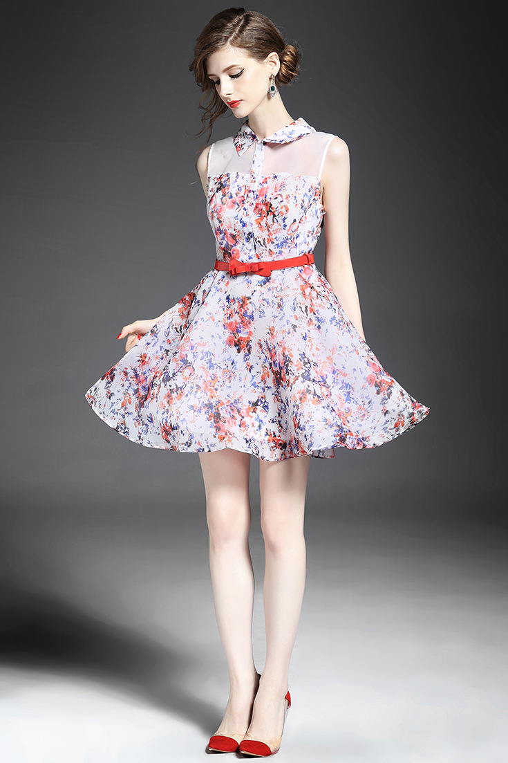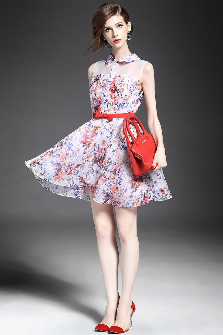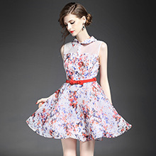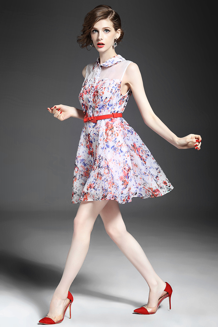 2015夏季女装新款 淑女气质翻领欧根纱拼接小碎花收腰修身a字裙