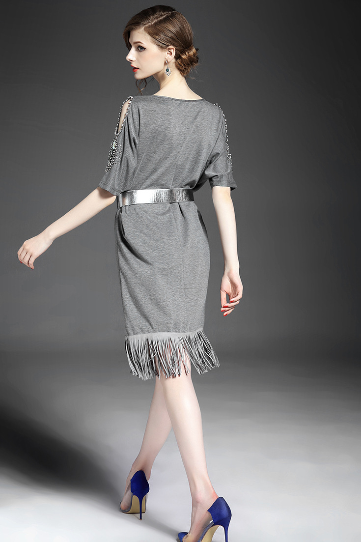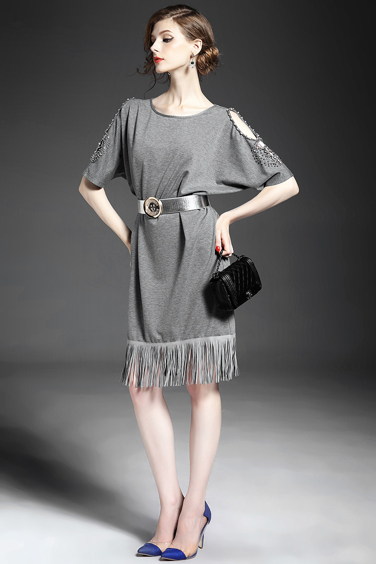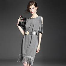 > 2015夏 时尚纯色露肩袖重工钉珠流苏气质宽松连衣裙送腰带