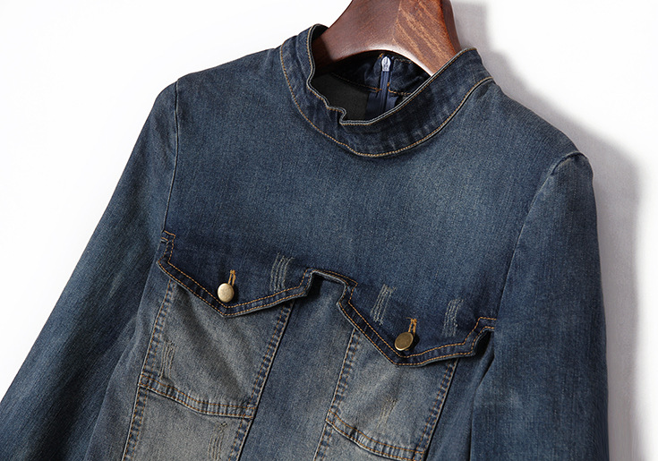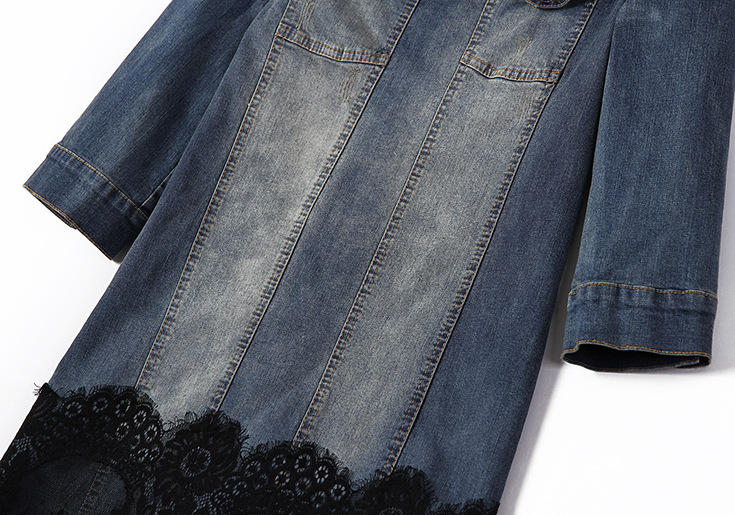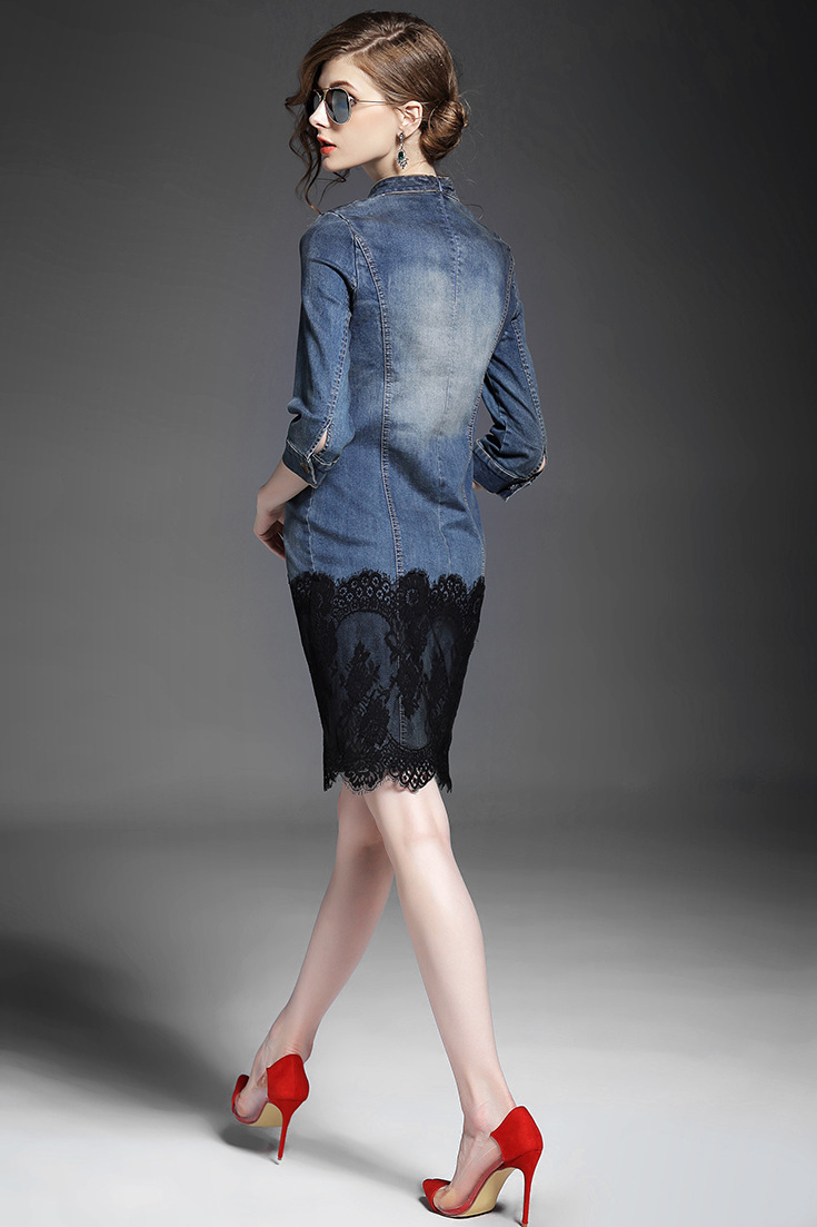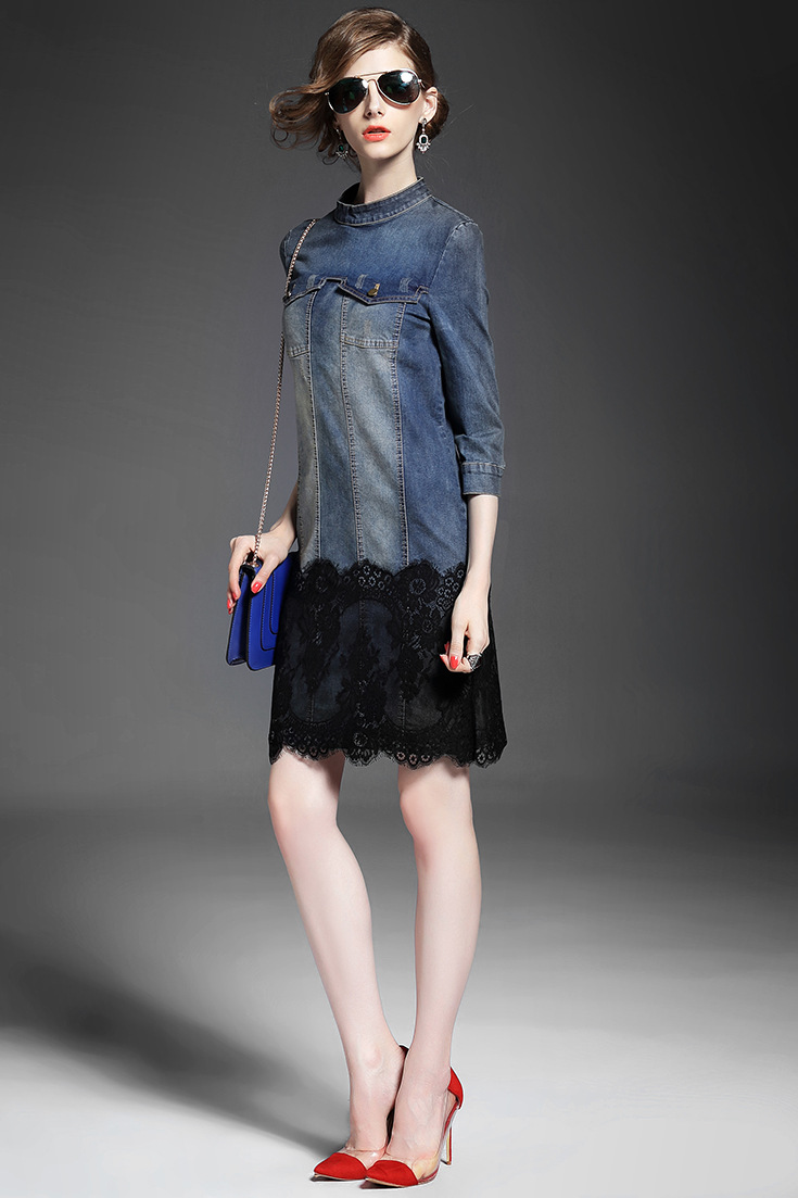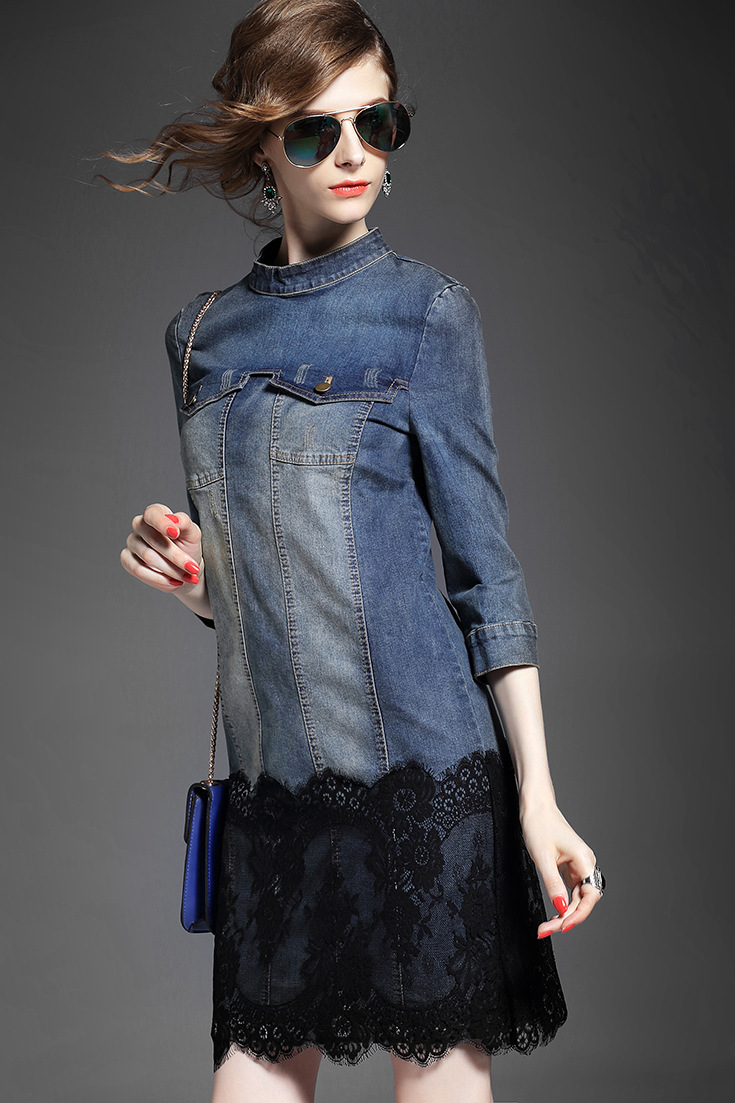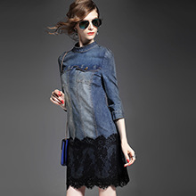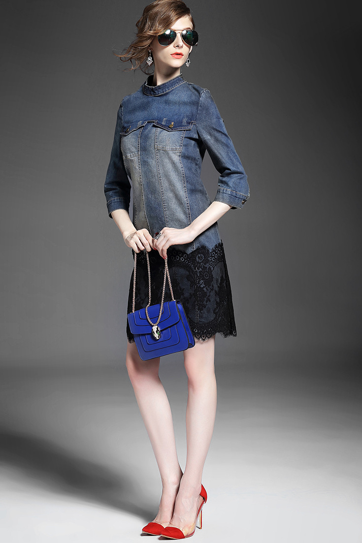 > 2015早秋女装新款 牛仔拼蕾丝立领七分袖修身一步连衣裙