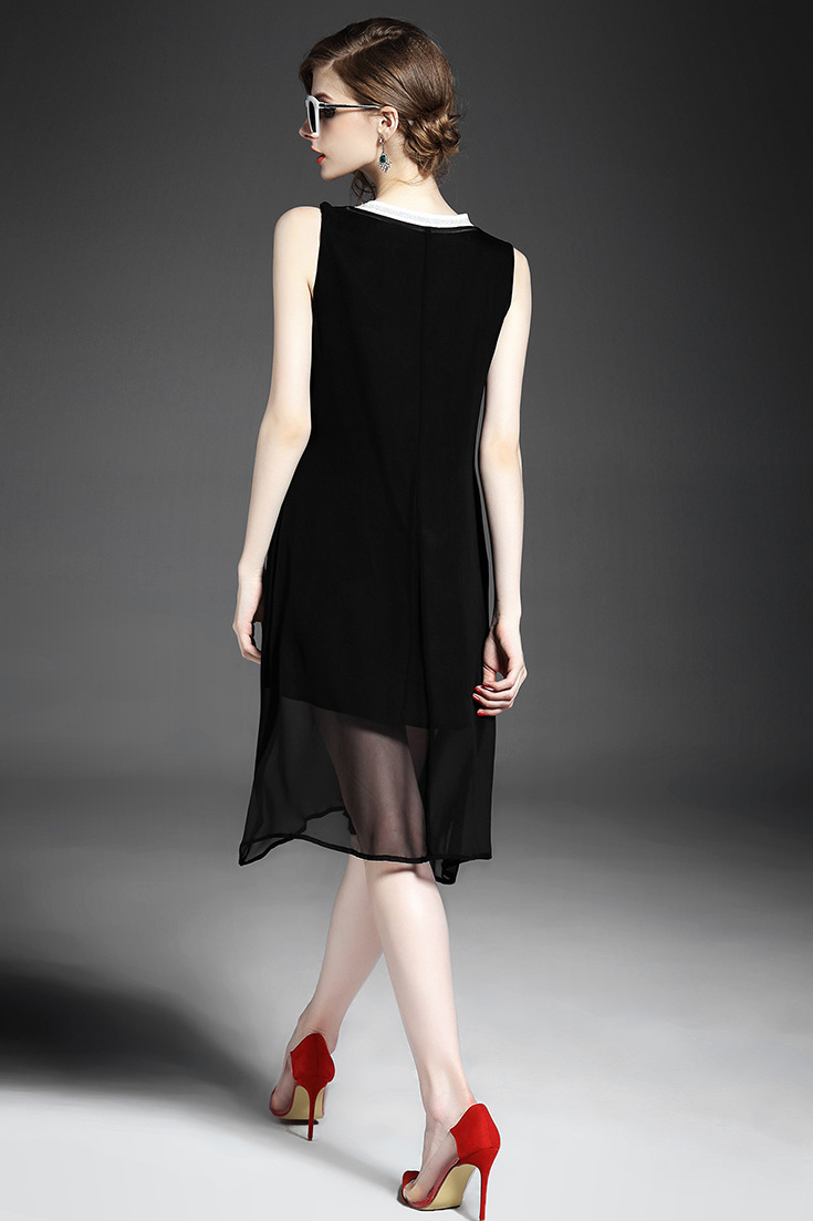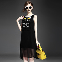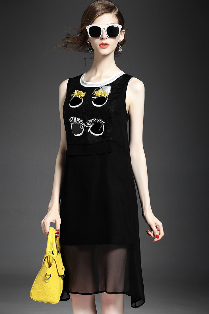 > 2015夏季新款 欧美个性眼睫毛立体绣花拼接无袖真丝连衣裙修身
