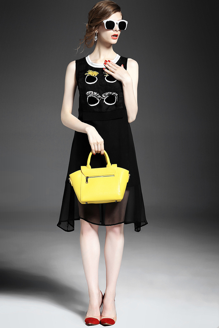 2015夏季新款 欧美个性眼睫毛立体绣花拼接无袖真丝连衣裙修身