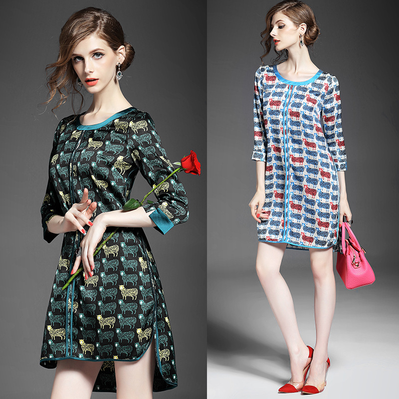 2015女装夏季新款 气质圆领七分袖动物印花不规则下摆连衣裙
