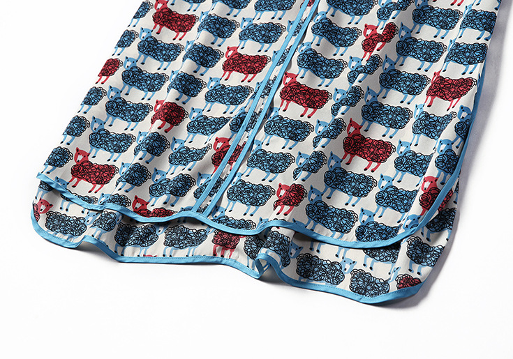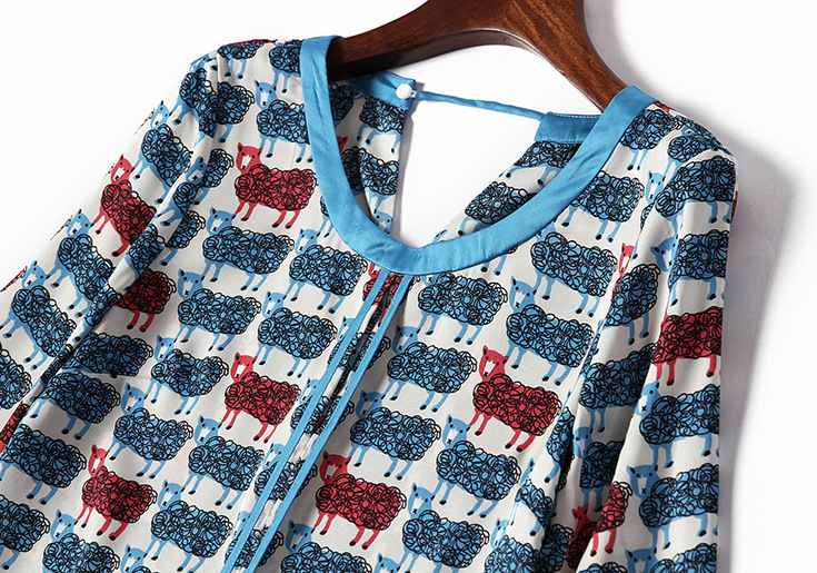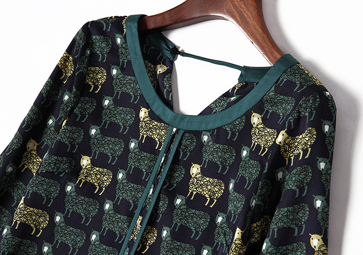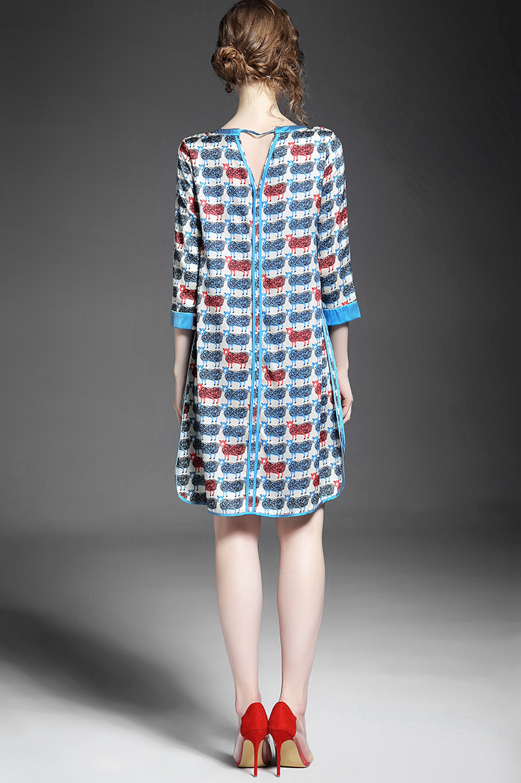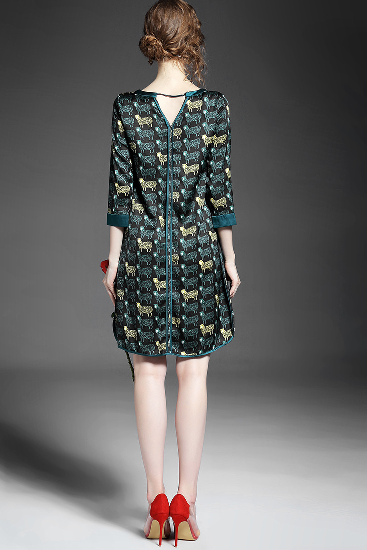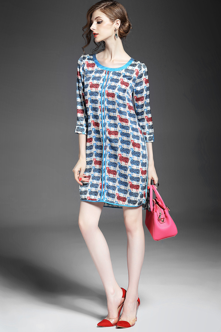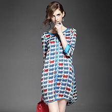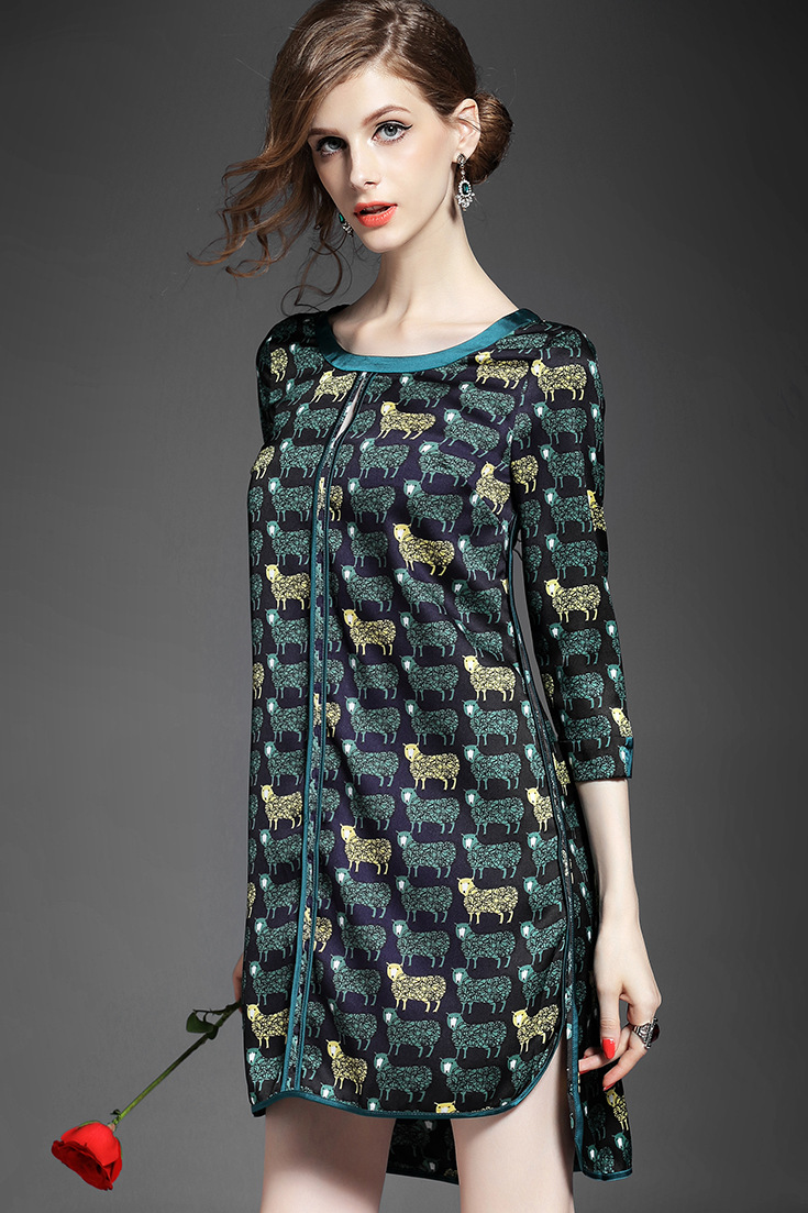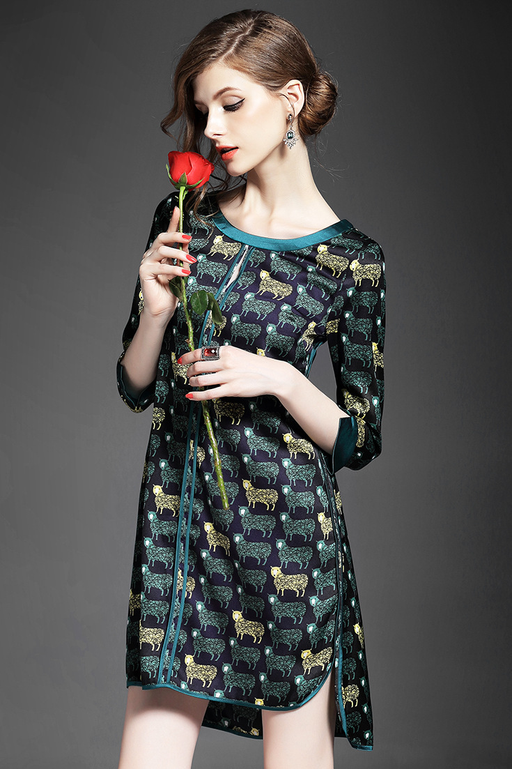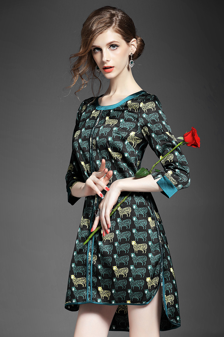 > 2015女装夏季新款 气质圆领七分袖动物印花不规则下摆连衣裙