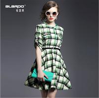 2015夏季女装欧美圆领格纹修身大摆A字裙连衣裙收腰显瘦送腰带