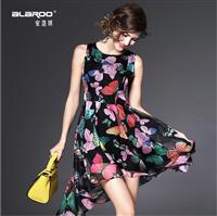 2015夏季新款女装欧美圆领无袖蝴蝶印花不规则下摆收腰修身连衣裙