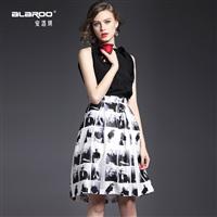 2015夏季新款女装 欧美大牌单件系带无袖上衣+人物印花半裙套装