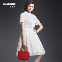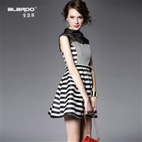 2015夏季新款 翻领欧根纱拼接黑白条纹修身a字裙