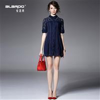 2015翻领短袖纯色蕾丝金线拼接修身a字裙连衣裙