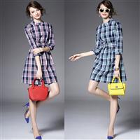 2015夏 欧美大牌立领格纹七分袖修身显瘦连衣裙送腰带