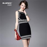 2015夏欧美女装v领无袖条纹高腰修身显瘦a字裙品牌连衣裙
