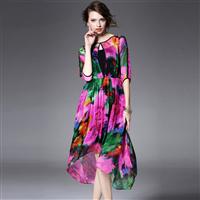 2015夏季新款 时尚圆领中袖气质印花下摆不规则真丝长裙