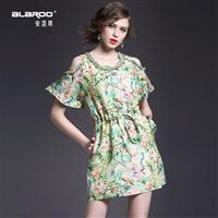 2015夏装新款欧美圆领花朵印花袖口蝴蝶结系带真丝连衣裙