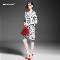 2015女装夏季新款 气质圆领七分袖动物印花不规则下摆连衣裙