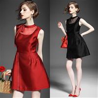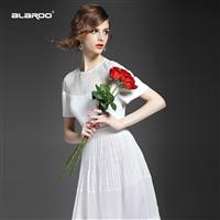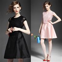 2015夏季新款 圆领包肩袖水溶绣花假两件拼接修身A字裙