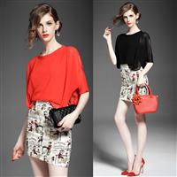 2015夏季新款 气质圆领蝙蝠袖乔其纱拼接手绘印花收腰包臀连衣裙