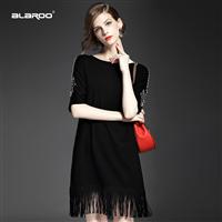 2015夏季新款 纯色钉珠镶钻露肩袖流苏拼接弹力棉宽松连衣裙