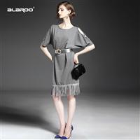2015夏 时尚纯色露肩袖重工钉珠流苏气质宽松连衣裙送腰带