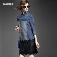2015早秋女装新款 牛仔拼蕾丝立领七分袖修身一步连衣裙
