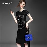 2015夏季女装新款 气质圆领薄纱弹力短袖时尚拼贴印花修身连衣裙