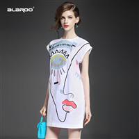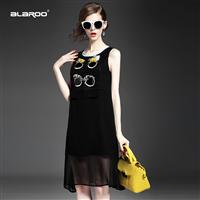 2015夏季新款 欧美个性眼睫毛立体绣花拼接无袖真丝连衣裙修身