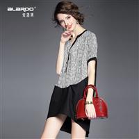 2015夏季新款 欧美时尚圆领中袖螺纹拼接印花真丝套头宽松连衣裙