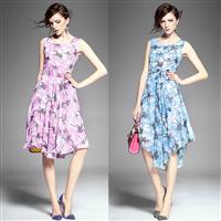 2015夏装新款 欧美时尚无袖圆领印花压褶弹力收腰修身a字裙