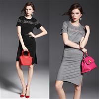 2015欧美女装夏季新款 弹力竖条纹下摆开叉系带修身一步裙显瘦