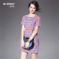 2015欧美大码女装夏季新款 圆领短袖条纹口袋拼接宽松气质茧型裙