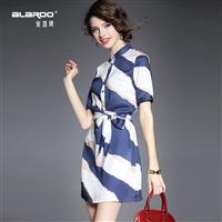 2015夏季新款女装 淑女立领短袖条纹撞色系带修身连衣裙子