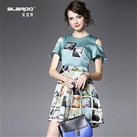 2015夏季女装 欧美圆领露肩喇叭袖真丝欧根纱印花高腰修身a字裙
