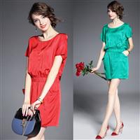 2015夏季女装新款 圆领露肩蝙蝠袖纯色弹力收腰铜氨丝连衣裙修身