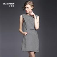 2015夏装新款 欧美立领无袖撞色条纹弹力收腰压褶系带修身a字裙