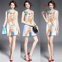 2015欧美新款女装 大牌时尚娃娃印花无袖冲孔波浪边大摆连衣裙