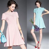 2015夏季新款 优雅纯色圆领钉珠收腰系带不规则连衣裙
