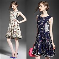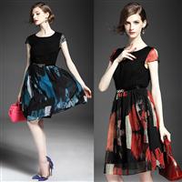 2015夏季女装新款 欧美圆领时尚印花网纱拼接修身a字裙连衣裙