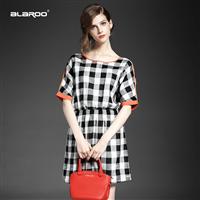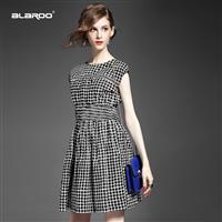 2015欧洲站夏季女装 圆领格纹压褶弹力收腰修身连衣裙棉麻精品