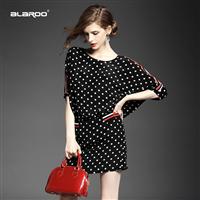 2015欧美女装气质波点条纹拼接弹力收腰宽松套头桑蚕丝连衣裙夏