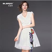 2015夏季新款 时尚v领包肩袖花朵绣花修身a字裙网纱裙
