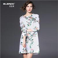 2015夏季新款 欧美时尚圆领包肩袖印花开叉压褶大摆连衣裙中长裙