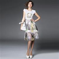 2015夏季女装 欧美高端印花束腰修身性感露背礼服蓬蓬裙子