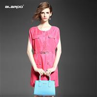 2015夏季女装精品 欧美大牌圆领蝙蝠袖弹力收腰修身真丝连衣裙
