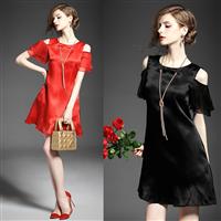 2015夏装新款 欧美高端圆领纯色真丝缎露肩公主裙气质a字裙送项链