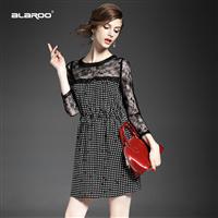 2015夏季女装 圆领蕾丝拼彩色波点印花弹力收腰修身真丝连衣裙