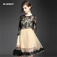 2015欧美女装夏季新款 圆领蕾丝花边拼接修身大摆a字裙送腰带