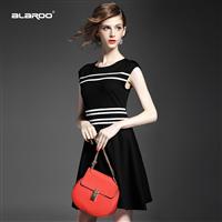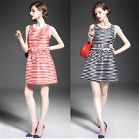 2015欧洲站夏季女装新款 圆领无袖黑白条纹撞色罗马棉修身连衣裙