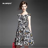 2015夏季女装新款 圆领无袖印花腰节钉珠收腰修身a字裙显瘦