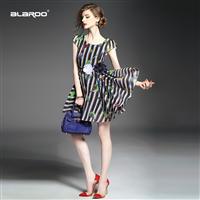 2015夏季女装新款 欧美高端圆领短袖撞色竖条纹印花修身大摆a字裙
