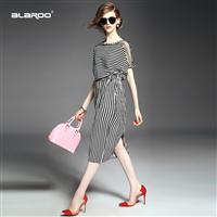 2015夏季女装 圆领露肩串珠拼接弹力收腰修身显瘦条纹中长连衣裙