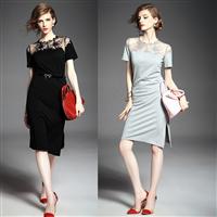 2015夏季新款 欧美大牌纯色气质波浪边绣花拼接弹力修身一步裙